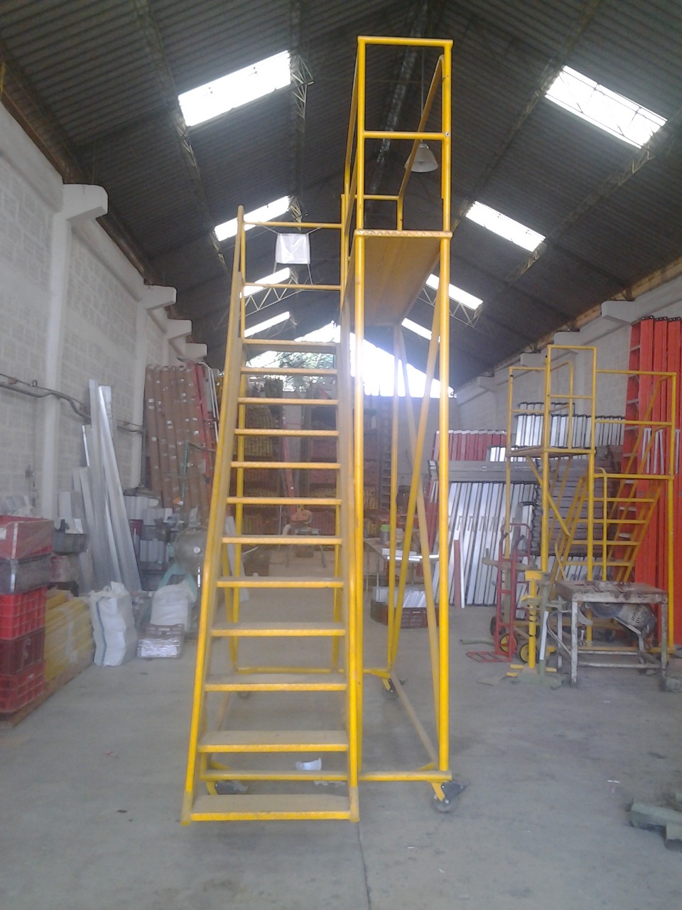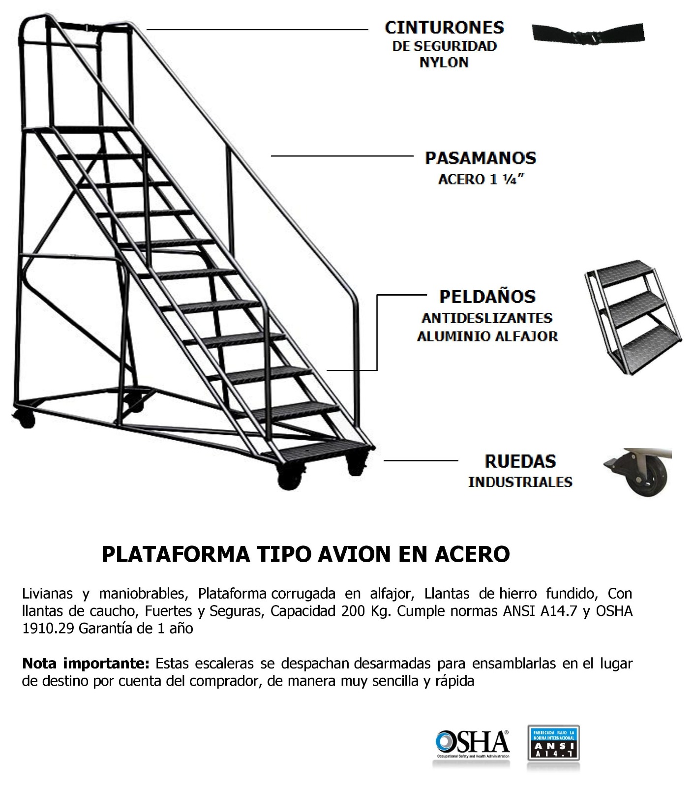 Cumplen la norma ANSI 14.7, OSHA 1910-29. Garantía de 1 año, pasamanos a ambos lados en tubos de 1 ¼” pulgadas de diámetro exterior (opcional), guarda pies en la plataforma, guarda cuerpos, Soldaduras a Argón.