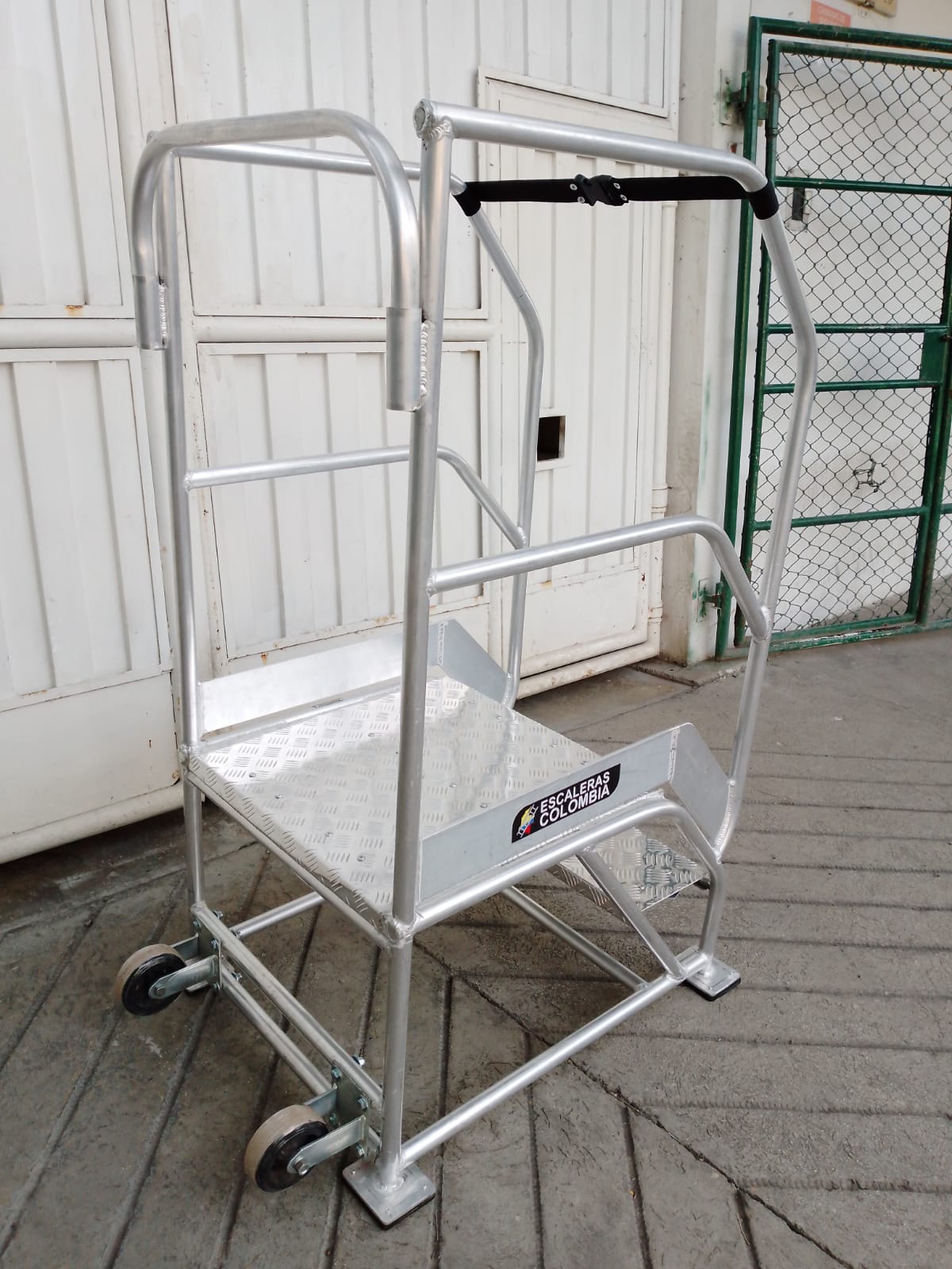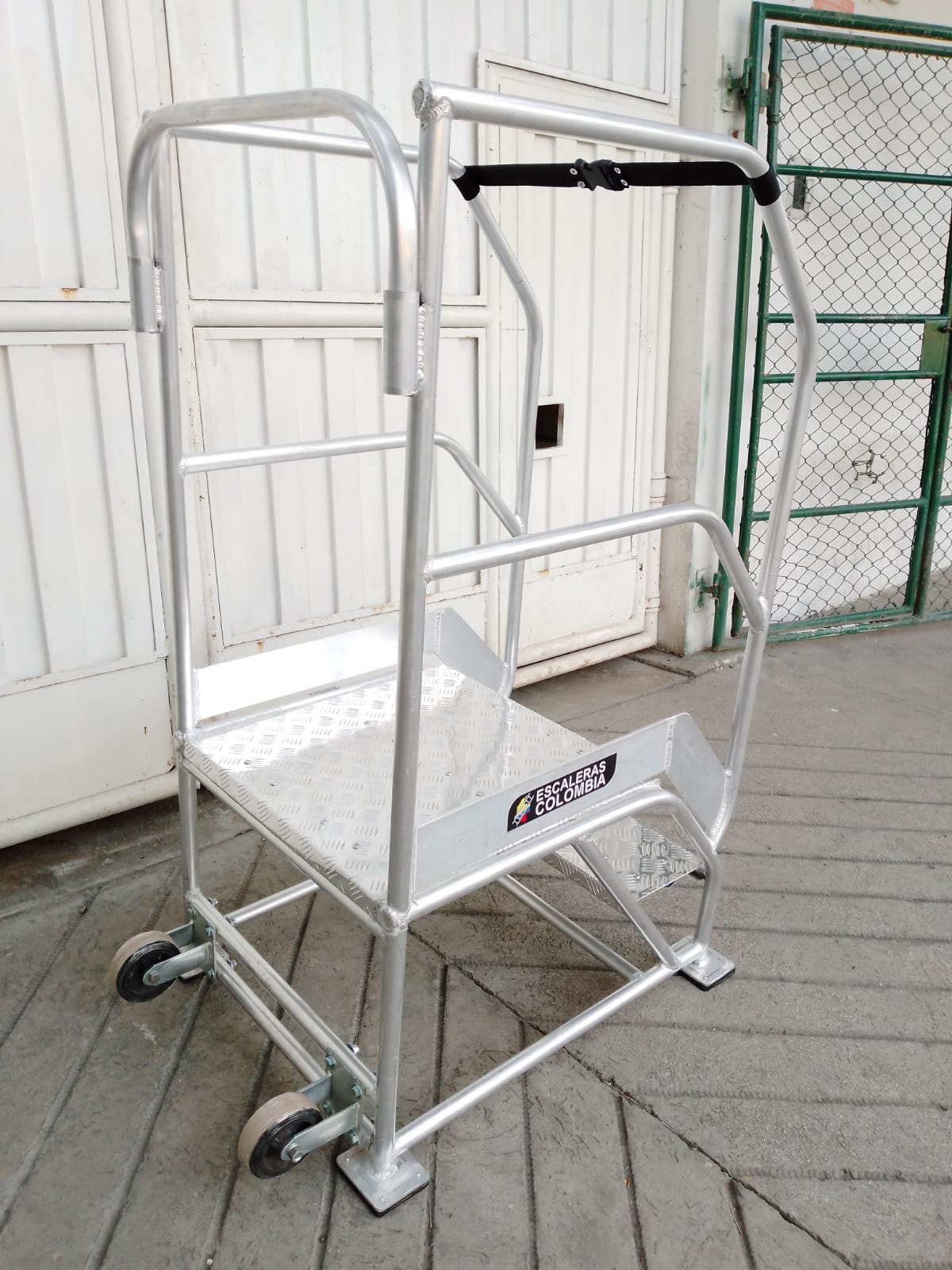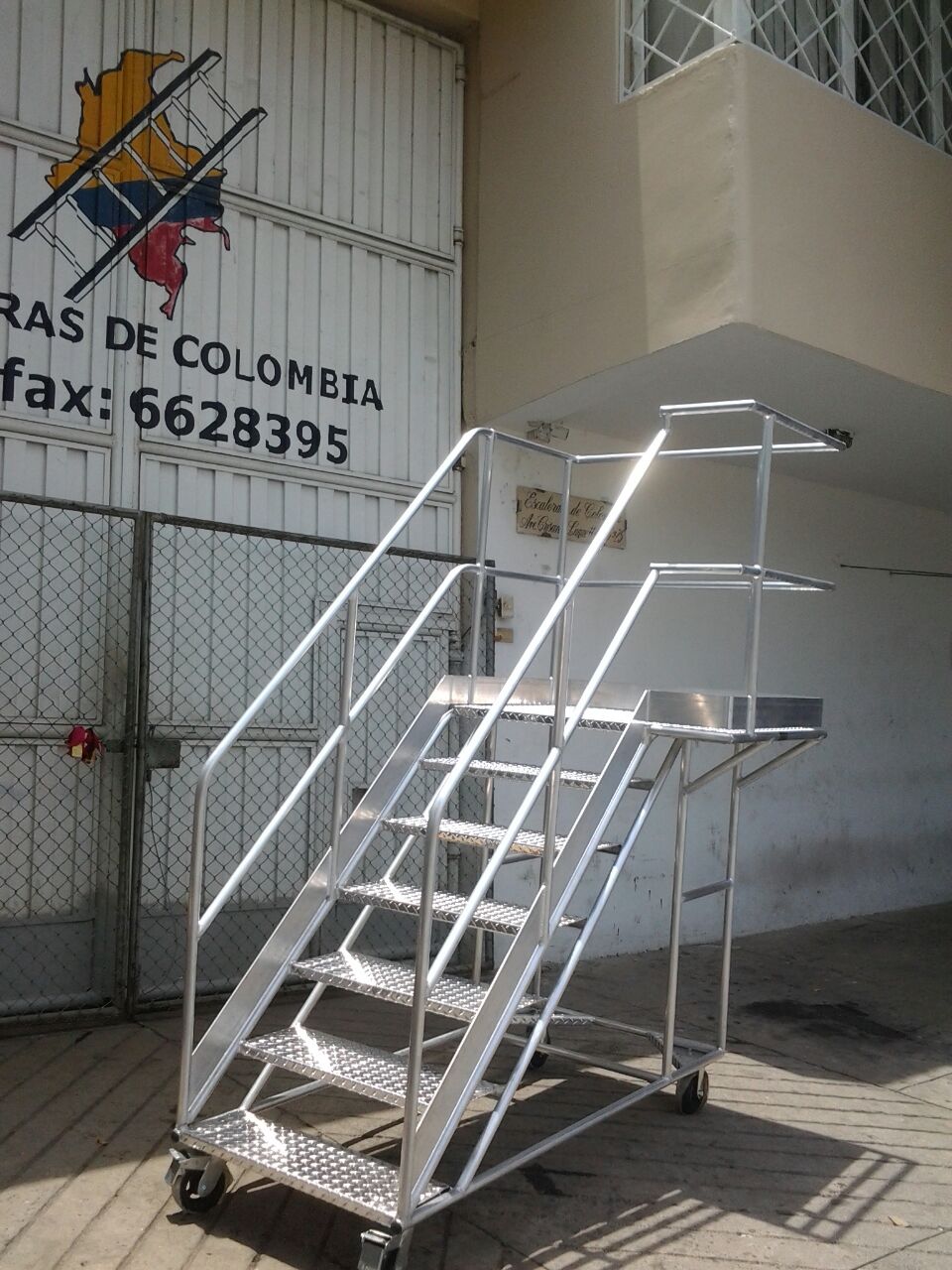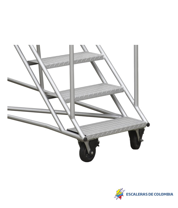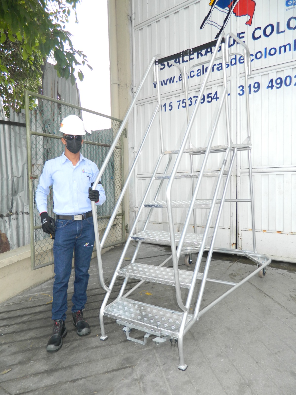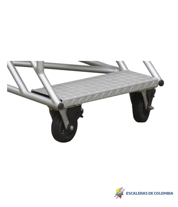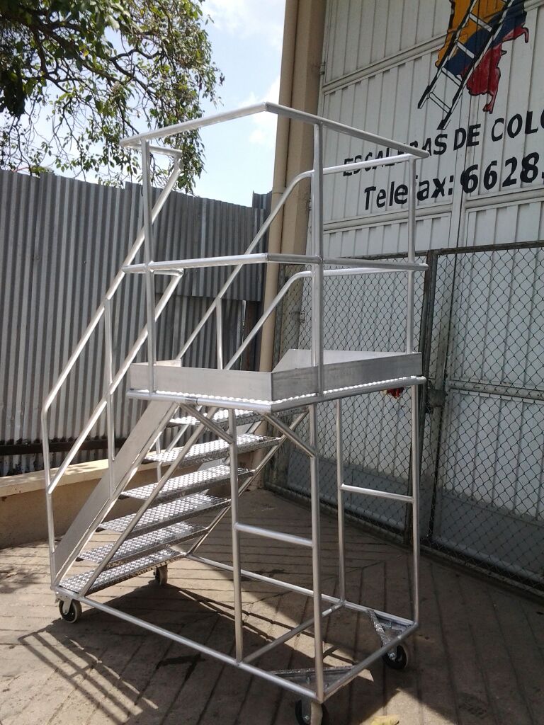 ESCALERAS CERTIFICADA TIPO AVIÓN ESPECIAL EN ALUMINIO, Altura a la plataforma 1.40 metros, Altura total 2.40 metros, Plataforma en aluminio corrugada de alfajor, 0.60 x 0.60 ms, con puertas dobles en entrada y salida, Ancho 0.60 ms, largo 1.70 ms, ruedas fijas atrás, con freno de pedal al frente, 6 pasos o peldaños en aluminio alfajor corrugado de 0.60 x 0.23 ms. Estructura con tubos de 1 1/4 ” Diámetro exterior, Capacidad 200 kilos o 400 libras, pasamanos dobles 0.50 y 1.0 metro a lados en tubos de 1 ¼” pulgadas de diámetro exterior, guarda pies, Soldaduras a Argón. Acabado Aluminio Crudo. Ángulo de subida 45° Grados, Altura de trabajo de 1.40 a 3.10 metros, Cumple norma ANSI 14.7 de la American Nacional Standard Instituto y OSHA 1910.29 Imágenes similares anexas. Ref. PAAL 1.40.