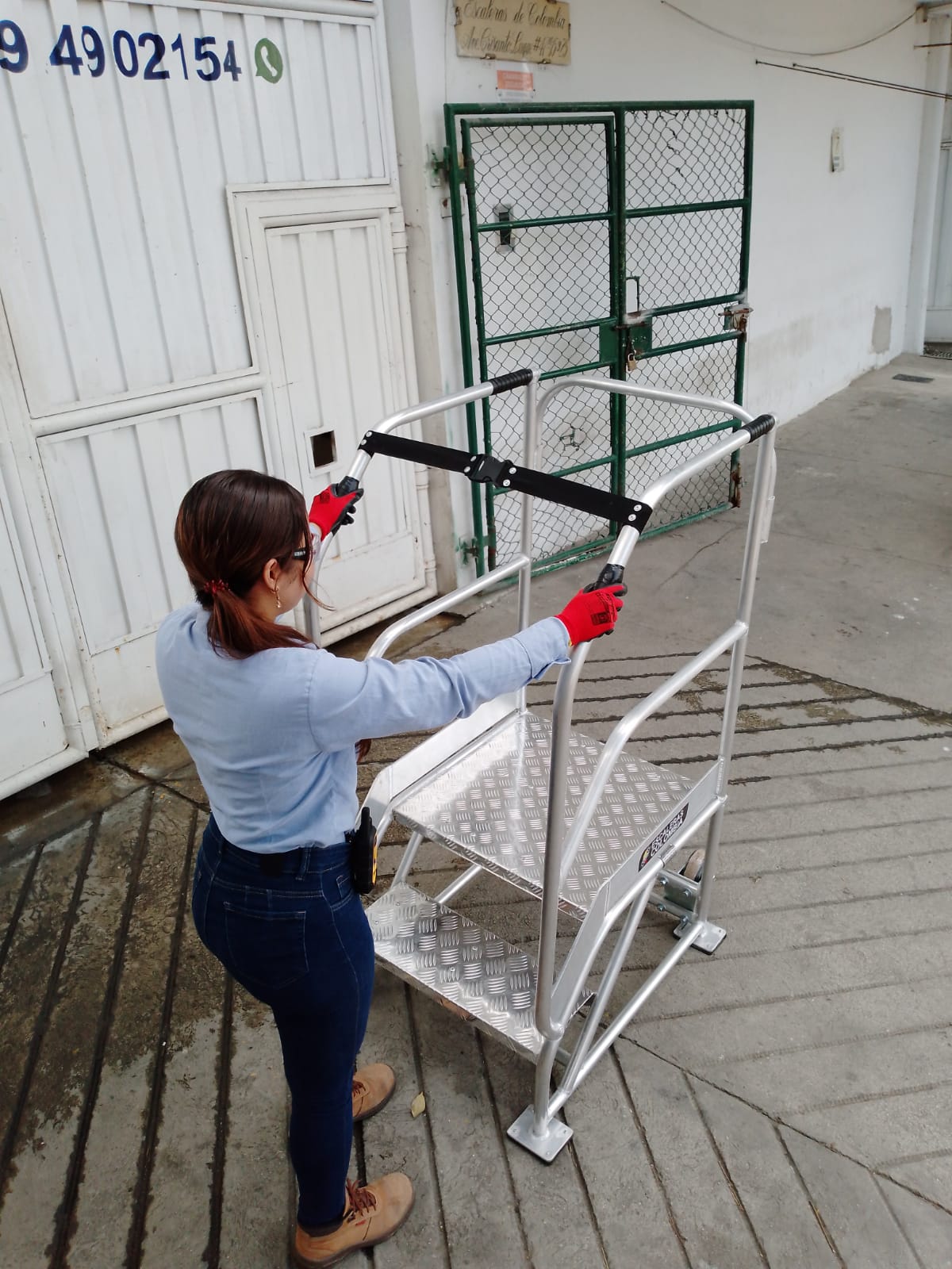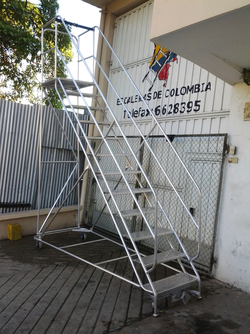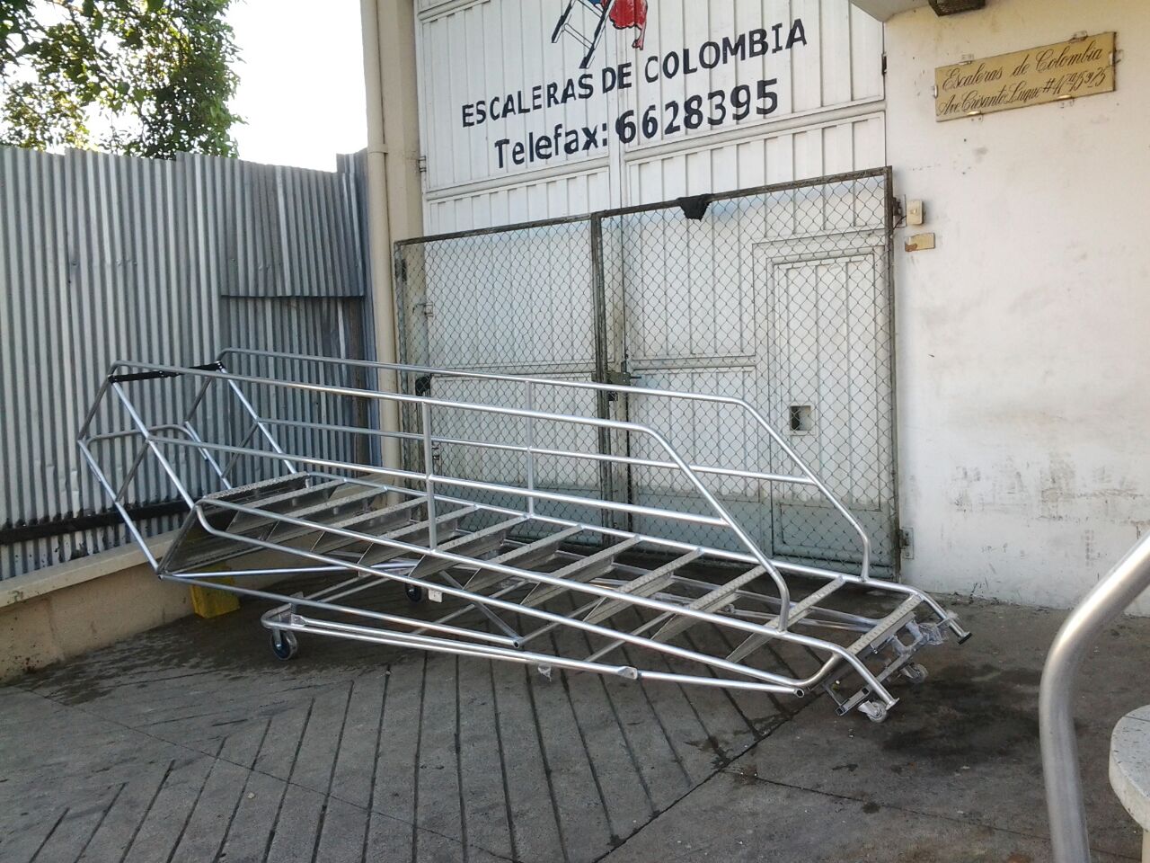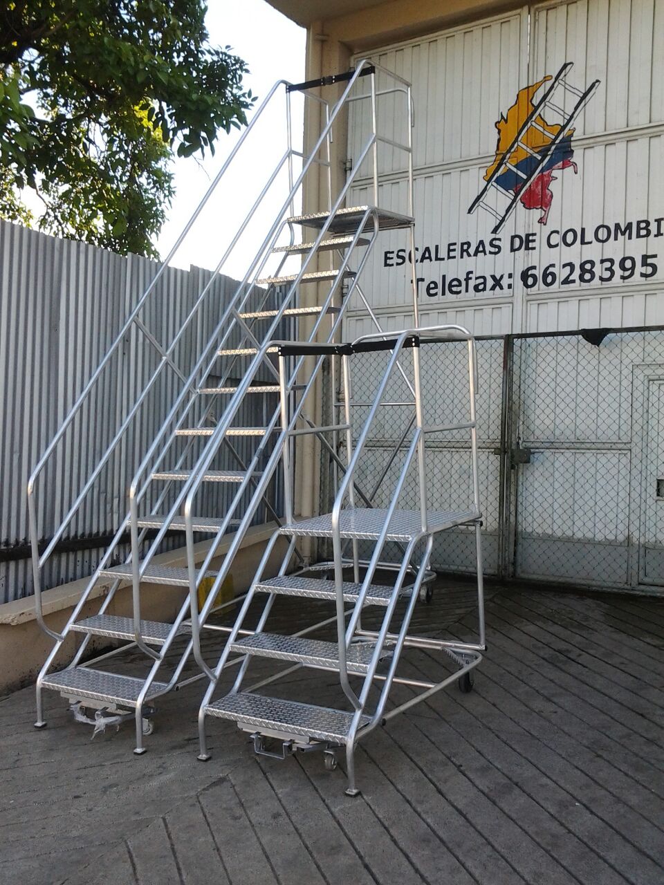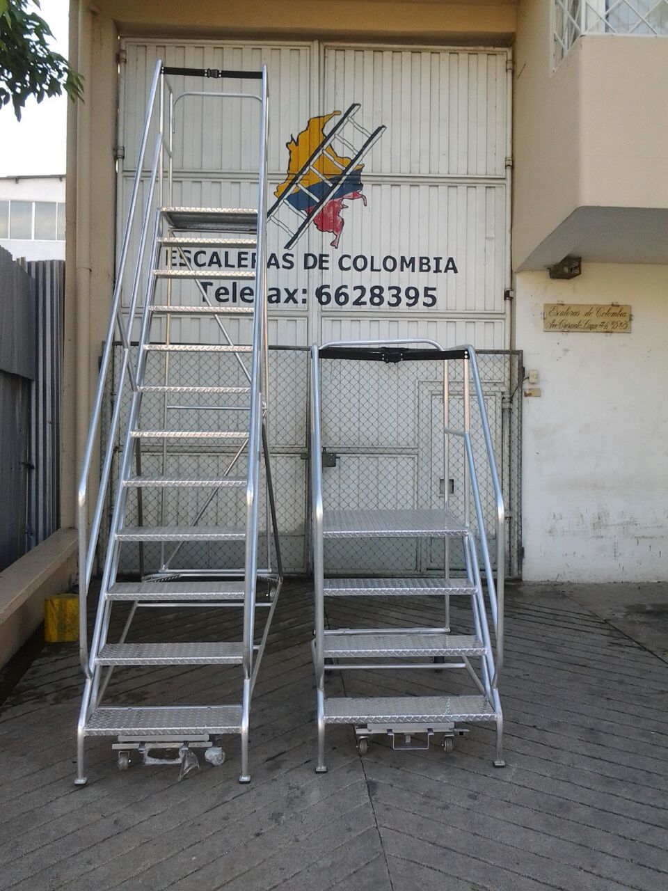 ESCALERAS CERTIFICADA TIPO AVIÓN ESPECIAL EN ALUMINIO, Altura a la plataforma 1.40 metros, Altura total 2.40 metros, Plataforma en aluminio corrugada de alfajor, 0.60 x 0.60 ms, con puertas dobles en entrada y salida, Ancho 0.60 ms, largo 1.70 ms, ruedas fijas atrás, con freno de pedal al frente, 6 pasos o peldaños en aluminio alfajor corrugado de 0.60 x 0.23 ms. Estructura con tubos de 1 1/4 ” Diámetro exterior, Capacidad 200 kilos o 400 libras, pasamanos dobles 0.50 y 1.0 metro a lados en tubos de 1 ¼” pulgadas de diámetro exterior, guarda pies, Soldaduras a Argón. Acabado Aluminio Crudo. Ángulo de subida 45° Grados, Altura de trabajo de 1.40 a 3.10 metros, Cumple norma ANSI 14.7 de la American Nacional Standard Instituto y OSHA 1910.29 Imágenes similares anexas. Ref. PAAL 1.40.