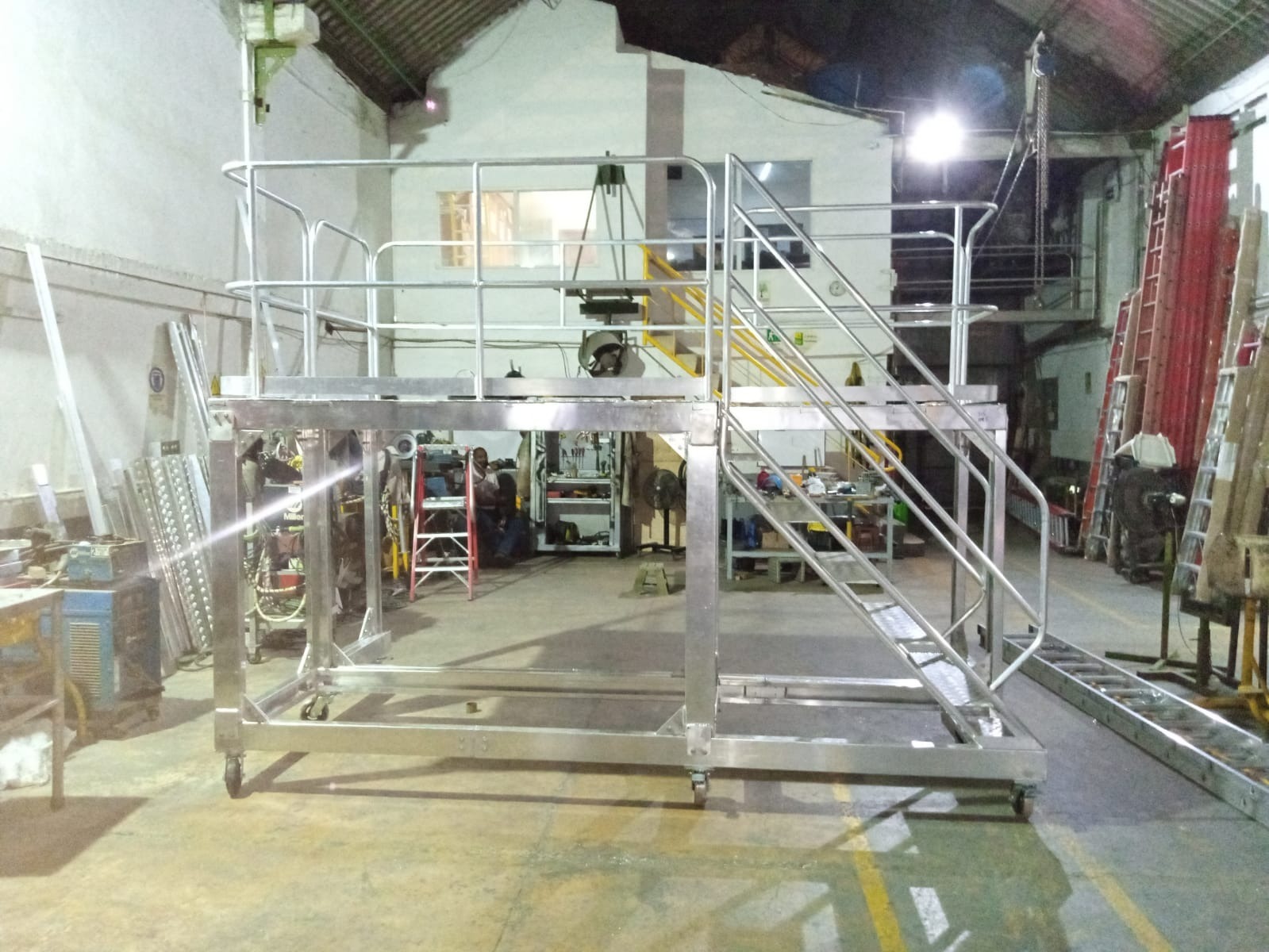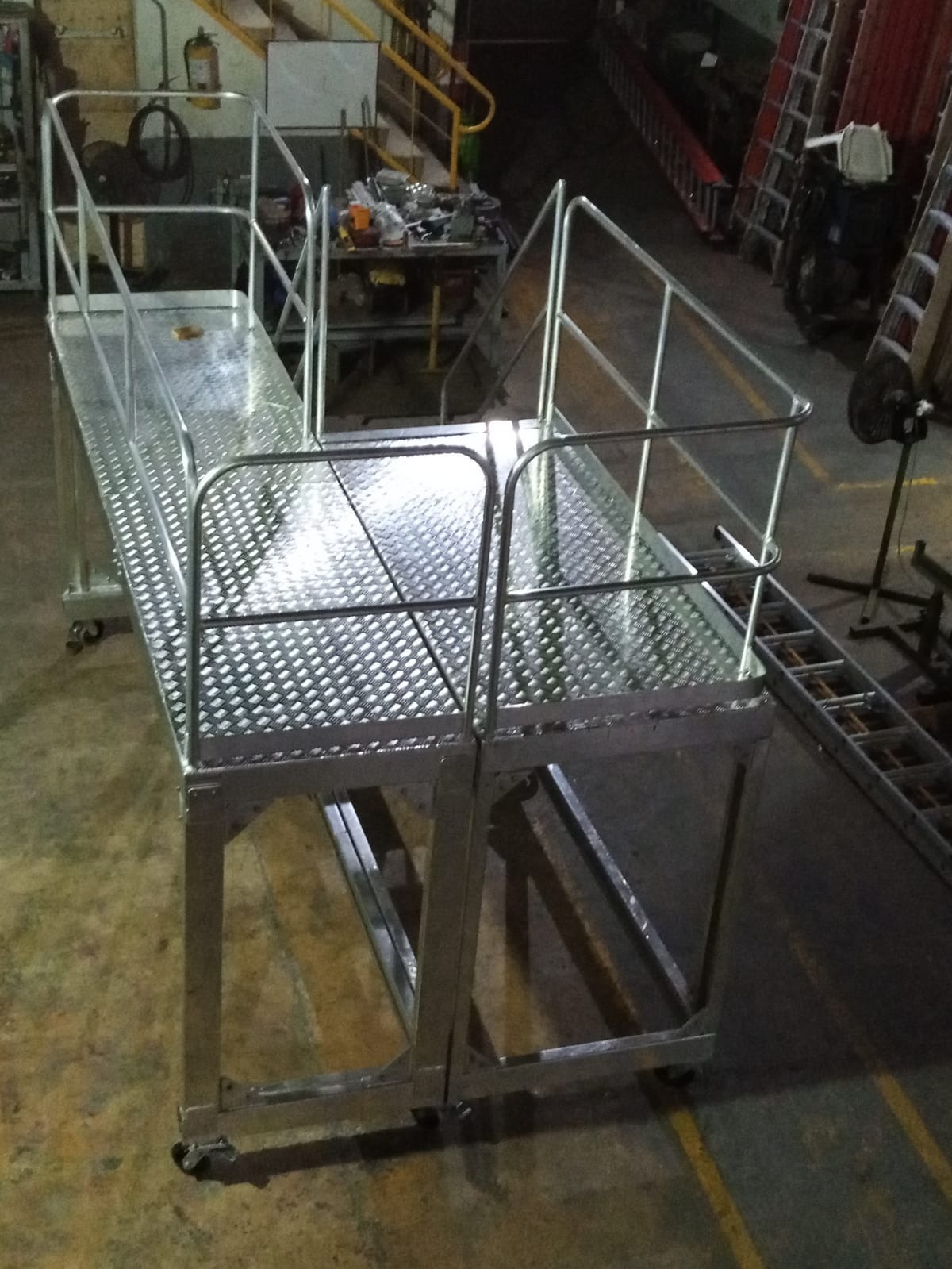 - PASAMANOS a ambos lados en tubos de 1 ¼” pulgadas de diámetro exterior (opcional), guarda pies en la plataforma, guarda cuerpos, Soldaduras a Argón.