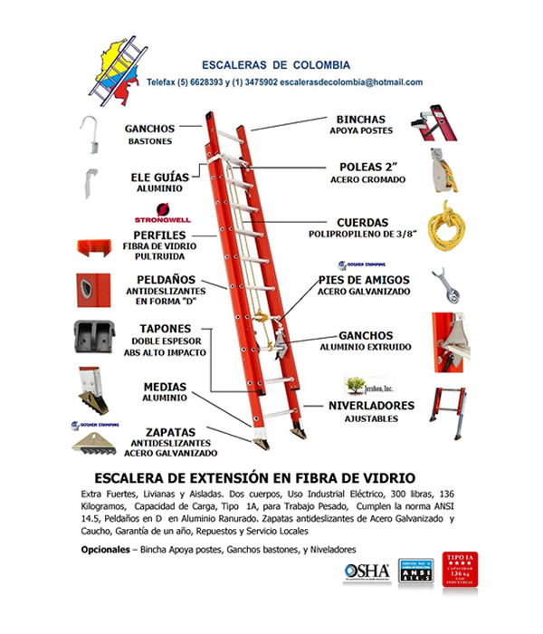 CALIDAD: Nuestras escaleras cumplen con las normas internacionales, específicamente con la Norma ANSI A 14.5 que regula la fabricación de las escaleras en Fibra de Vidrio. Certificación Nacional del Laboratorio de la Empresa de Teléfonos de Bogotá y de Ecopetrol Dpto. de Calidad, también del Laboratorio de Pruebas de la Universidad de Panamá.
