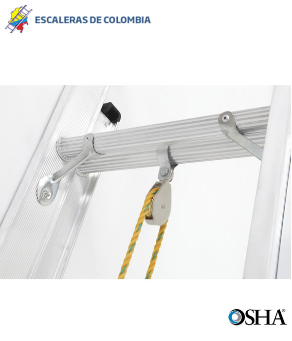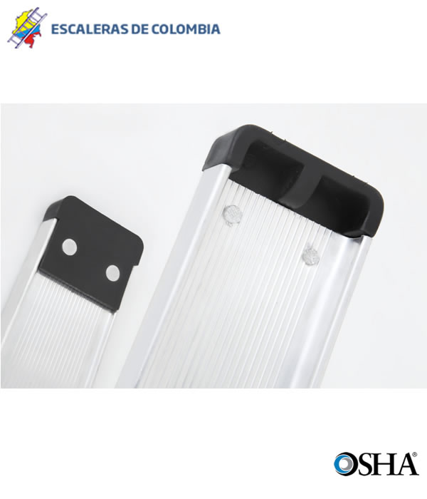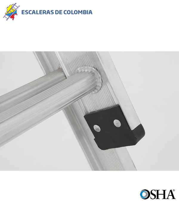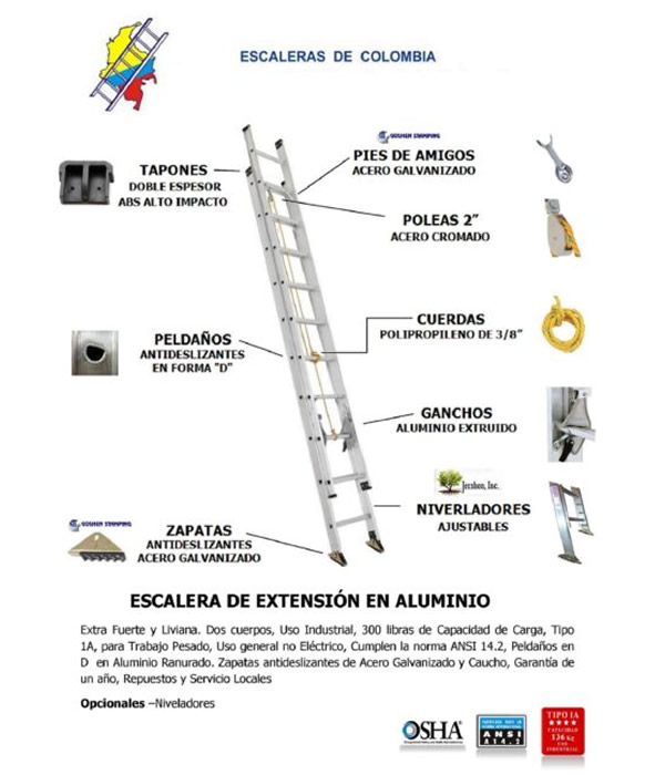 Extra Fuerte y Liviana. Dos cuerpos, Uso Industrial, 300 libras de Capacidad de Carga, Tipo 1A, para Trabajo Pesado, Uso general no Eléctrico, Cumplen la norma ANSI 14.2, Peldaños en D en Aluminio Ranurado. Zapatas antideslizantes de Acero Galvanizado y Caucho, Garantía de un año, Repuestos y Servicio Locales