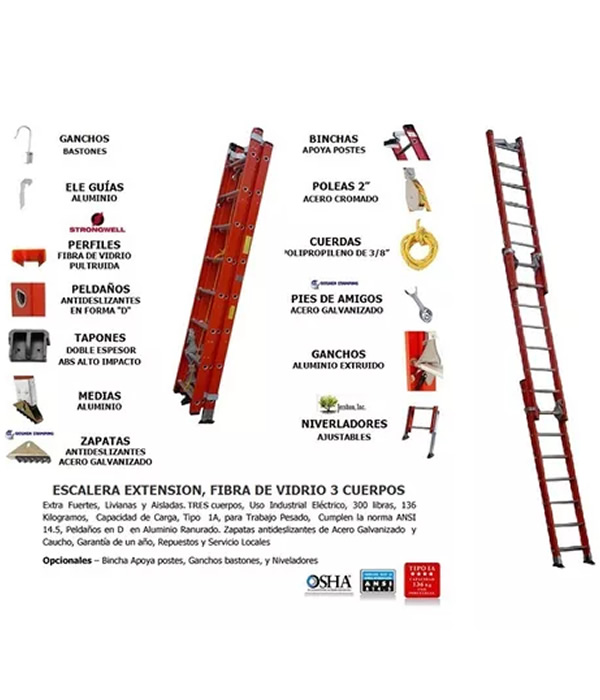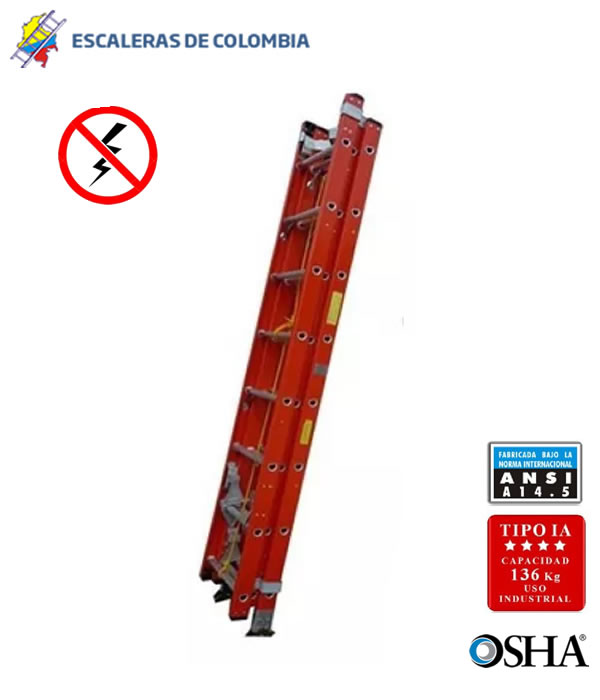 FICHA TECHNICA: Dos o Tres Cuerpos Independientes. PERFILES ó Rieles Pultruidos: Son fabricados con resina de poliestireno, reforzados con Fibra de Vidrio, con inhibidor de rayos ultravioleta, para retardar el fenómeno de envejecimiento por la exposición solar, son livianos, más resistentes, con un alto nivel de aislamiento, gran resistencia mecánica y uniformidad en las características eléctricas y mecánicas; nuestro proveedor es la Strongwell, de Estados Unidos, ellos tienen patentado este material como EXTREN 525 específicamente para la fabricación de perfiles para escaleras de uso eléctrico y también de tubos para pértigas. Es un material específicamente adecuado para uso eléctrico a intemperie. La Strongwell provee de tubos y perfiles a casi todos los fabricantes de Pértigas y Escaleras en Fibra de Vidrio de los Estados Unidos. Como son la Hasting, AB Change, Werner, Stanley, Louiville, y muchos otros. GANCHOS de aluminio por inyección. TAPONES (Terminales Protectores) de Plástico ABS de alto impacto, muchísimo más fuertes y robustos que los usuales de otros fabricantes. TUBOS PELDAÑOS de duraluminio fuertes y livianos, con un labrado o estrías profundas muy especial y diferente, que garantiza una mejor adherencia a la suela de los zapatos del operario. CUERDA de polietileno de mayor diámetro 3/894 ó 10 milímetros, que facilita el manejo sin guantes. POLEA central de Acero Galvanizado, con mayor diámetro y elevada resistencia que no se atasca. REMACHES más fuertes y durables. REMACHADO COLOMBIA, es el proceso por el cual el tubo del peldaño se deforma controladamente y se sella al perfil, larguero (riel) ó paral; son exclusivamente usadas en nuestras escaleras. Peso, medidas y características homologadas a los Estándares y Normas Internacionales. CAPACIDAD DE CARGA: Producimos escaleras TIPO 1A EXTRAPESADO PARA las normas USO ELECTRICO INDUSTRIAL con la máxima capacidad de carga de diseño de 300 Libras o 136 Kilogramos. También producimos escaleras Tipo Comercial con capacidad de carga de 250 Libras o 114 Kilogramos.ZAPATAS ultra resistentes de acero galvanizado, suela de caucho antideslizante.
