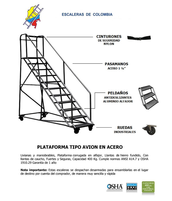 ESCALERAS CERTIFICADA TIPO AVIÓN ESPECIAL EN ALUMINIO, Altura a la plataforma 1.40 metros, Altura total 2.40 metros, Plataforma en aluminio corrugada de alfajor, 0.60 x 0.60 ms, con puertas dobles en entrada y salida, Ancho 0.60 ms, largo 1.70 ms, ruedas fijas atrás, con freno de pedal al frente, 6 pasos o peldaños en aluminio alfajor corrugado de 0.60 x 0.23 ms. Estructura con tubos de 1 1/4 ” Diámetro exterior, Capacidad 400 kilos o 880 libras, pasamanos dobles 0.50 y 1.0 metro a lados en tubos de 1 ¼” pulgadas de diámetro exterior, guarda pies, Soldaduras a Argón. Acabado Aluminio Crudo. Ángulo de subida 45° Grados, Altura de trabajo de 1.40 a 3.10 metros, Cumple norma ANSI 14.7 de la American Nacional Standard Instituto y OSHA 1910.29 Imágenes similares anexas. Ref. PAAL 1.40.