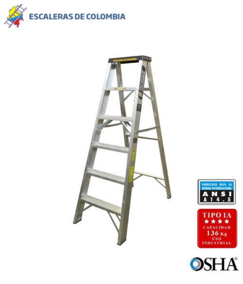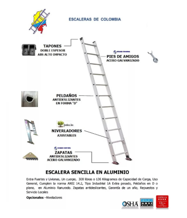 Extra Fuertes y Livianas, Un cuerpo, 300 libras o 136 Kilogramos de Capacidad de Carga, Uso General, Cumplen la norma ANSI 14.2, Tipo Industrial 1A Extra pesado, Peldaños en D o plano, en Aluminio Ranurado. Zapatas antideslizantes. Un Solo Cuerpo. Garantía de un año, Repuestos y Servicio Locales.