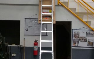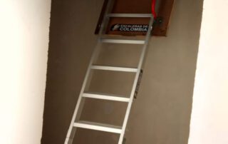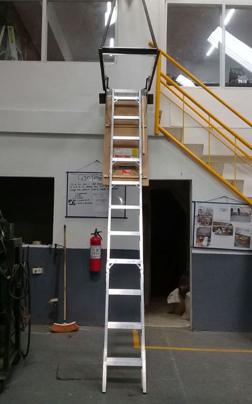 Escalera retráctil que se instala en un panel de acceso / puerta del ático. Se utilizan como una alternativa económica y compacta a tener una escalera que asciende al ático de un edificio. Son útiles en áreas con limitaciones de espacio que dificultarían la instalación de una escalera estándar. Las escaleras para áticos suelen consistir en una escalera con escalones más anchos y una pendiente pronunciada. Un cordón colgará para permitir que la escalera se extienda manualmente