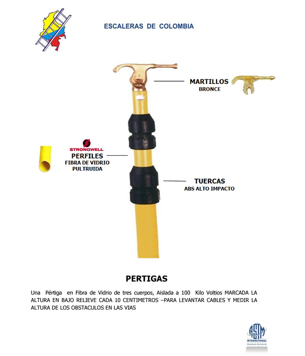 Nuestras pértigas están fabricadas con tubos de resina poli estireno, reforzada con Fibra de Vidrio, los tubos se importan de los Estados Unidos, específicamente para Pértigas de uso eléctrico. Estos tubos tienen una serie de aditivos especiales para bloquear la acción de los rayos ultravioletas, que la deterioran; tienen otros para reducir la capacidad de atrapar agua o liofobos, retardantes de fuego, también un pigmento especial que no es conductor de la electricidad. Estos mismos tubos los usan casi todos los fabricantes de Estados Unidos que producen pértigas.